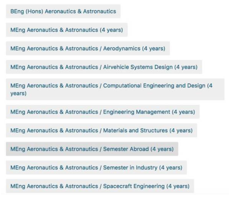 每个学院下面有很多学科,每个学科又有许多course。比如南安很强的航空航天学科,有很多不同的专业【见下图】。大家在选的时候一定要研究好那些长得像的专业之间的区别。