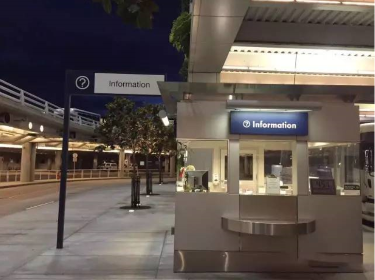 机场里面和外面都有咨询处(如图),同学们可以询问机场工作人员,他们会告诉你在哪里乘坐大巴。