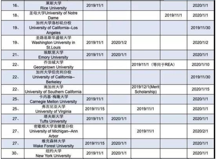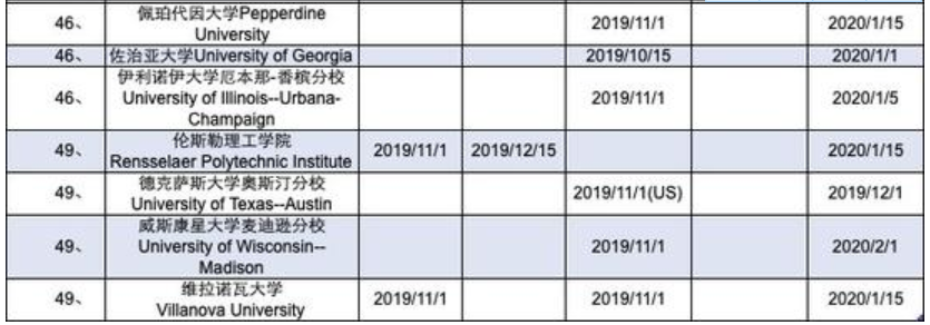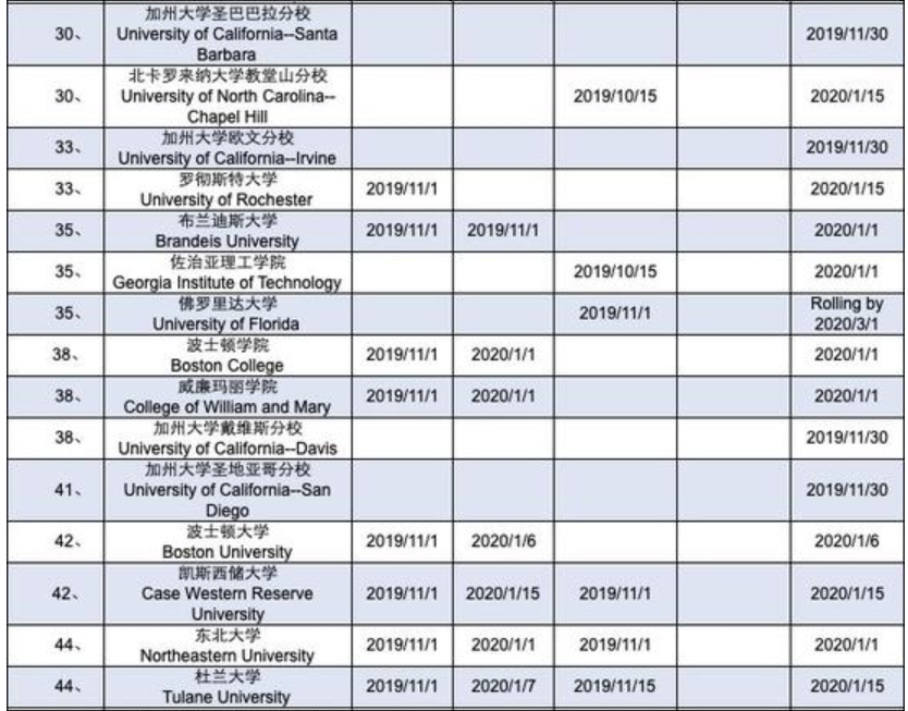 《2019-2020美国TOP50综合性大学申请截止日期》