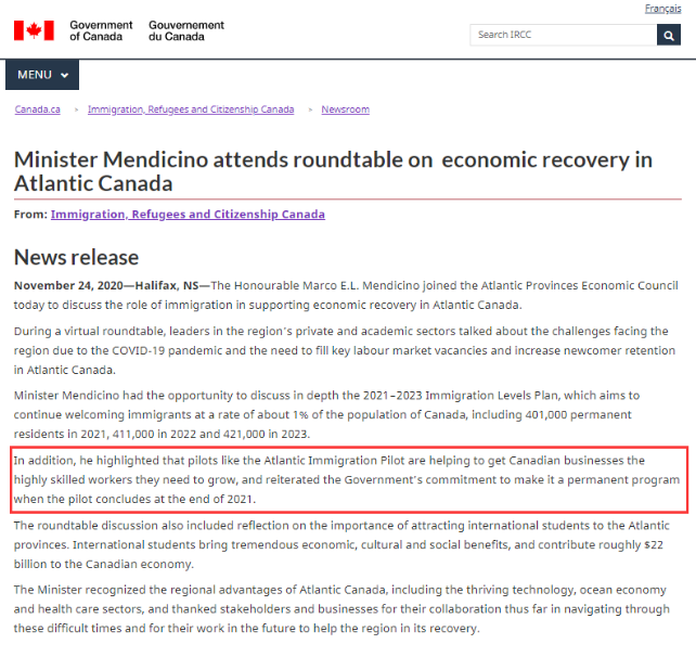 11月24日,加拿大移民部长参加了大西洋有关经济复苏的圆桌会议,在会议中他指出政府将承诺在2021年底试点计划到期后将其转为永久计划。