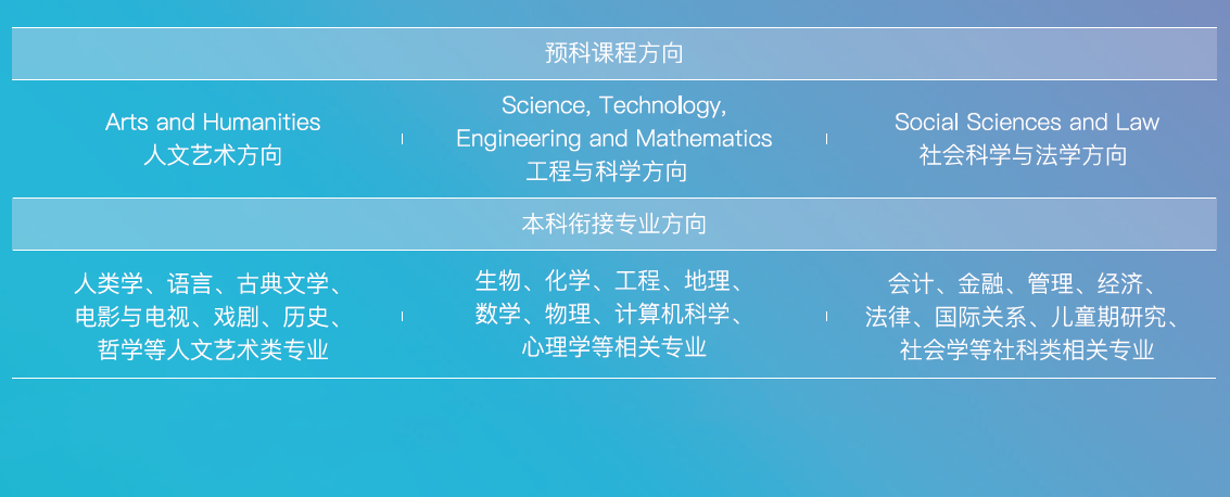布大本校预科课程提供三大方向:人文艺术方向、工程与科学方向、社会科学与法学方向,每个方向都提供相应的学术英语课程和专业类课程,学生可根据自己将要学习的本科专业领域选择自己的预科方向。