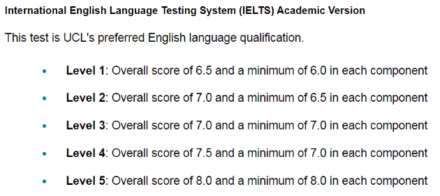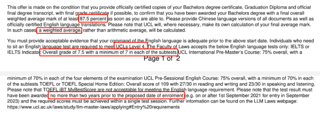 再举个例子,假设你申请的专业在官网上写的语言要求是 level 1,也就是雅思6.5分,而你的雅思成绩是7分。那么,你可能会收到一个有条件录取offer,要求你的雅思成绩达到7.5分。这是因为虽然你达到了最低语言要求,但UCL认为你还有提升的空间,所以给你一个激励。