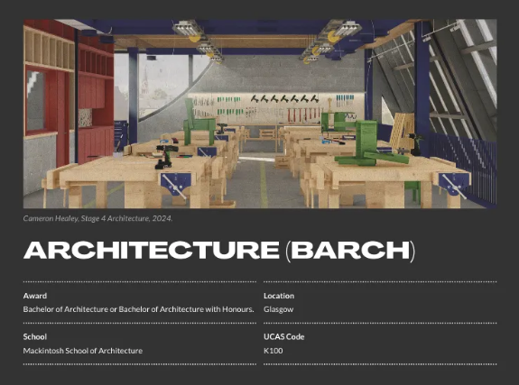建筑学学士课程是一个协作课程,学生有机会与格拉斯哥艺术学院其他学科的学生以及来自合作机构的其他建筑专业人士合作。