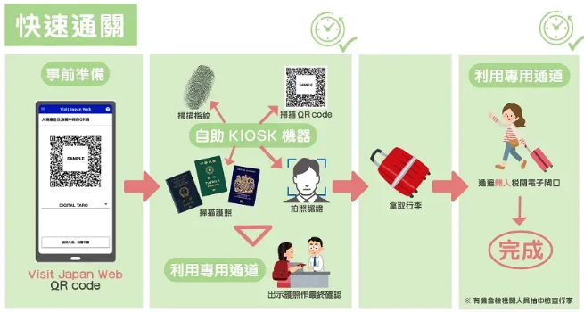快速通关的核心前提是完成 Visit Japan Web 全项资料填报并生成 QR 码。若入境航厦未配备自助通关机 KIOSK,即使完成系统填报,仍需向入境审查及海关人员分别出示 QR 码办理手续。具体操作步骤如下: