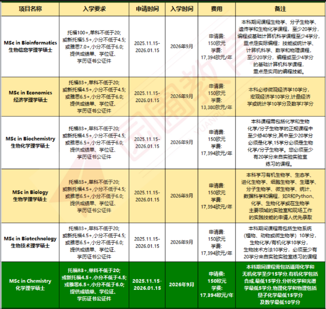 研究生英文授课专业、学费及要求: