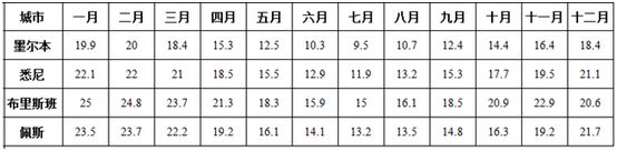 澳大利亚主要城市全年平均温度(摄氏度℃)