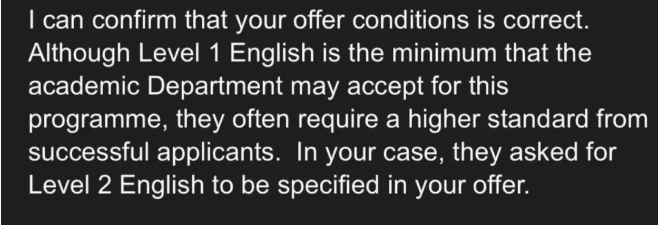 相反的情况也有,有时候一个专业的录取情况不是很理想,没有更多优秀的申请者,或者有很多申请者放弃了offer,那么大学可能会在offer中要求你达到的标准更低,比如语言要求从level 2降低到level 1。