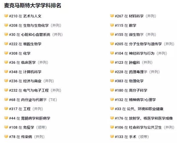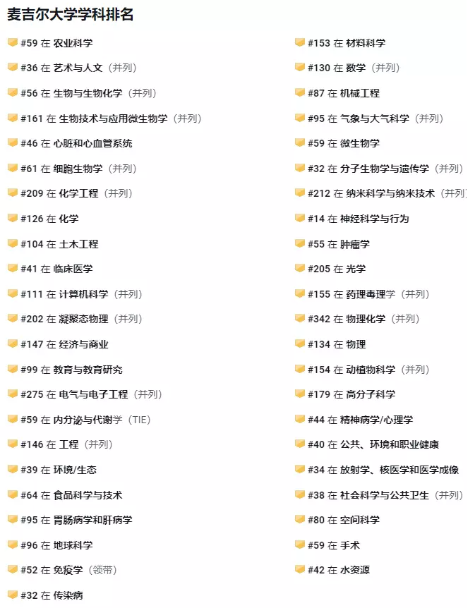 下面让我们来一起看麦吉尔大学的学科排名情况: