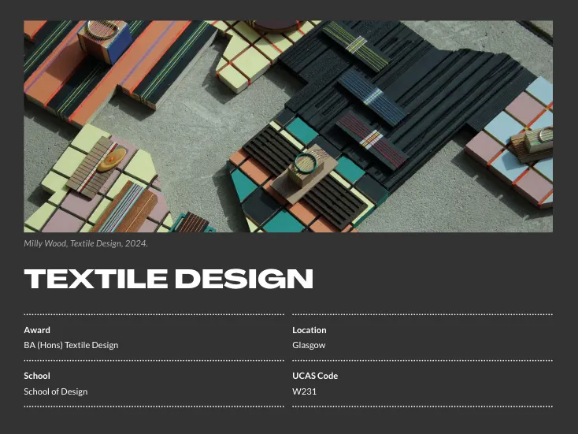 该专业旨在培养自信且专业的纺织设计毕业生,他们具有个人和创意身份,为就业、自主创业和研究生学习做好准备。GSA毕业生的作品展示了独特性和多样性,面向个人兴趣和创意愿望。