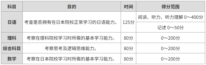科目:日语、理科(物理/化学/生物,一般针对理科生)、综合科目(一般针对文科生)、数学1(一般针对文科生)、数学2(一般针对理科生)