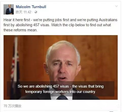 4月18日,澳洲总理谭宝(Malcolm Turnbull)通过社交网站Facebook宣布计划废除457海外劳工签证,并采用新的临时签证取而代之。